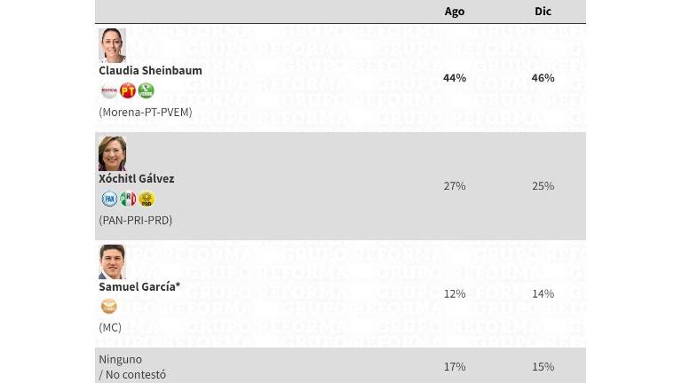 Nacional Preferencias electorales rumbo a las Elecciones 2024 publicadas por el diario Reforma.( Foto: Gráfico Reforma ) Nacional Sheinbaum tiene 21 puntos de ventaja sobre Xóchitl: encuesta Reforma 4 diciembre 2023