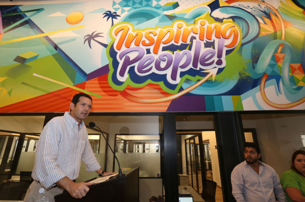 Gente Carlos Castañón, al momento de compartir un mensaje.( Rafael Villalba ) Gente "Con corte de listón y charla inauguran IQ Work" 23 julio 2019