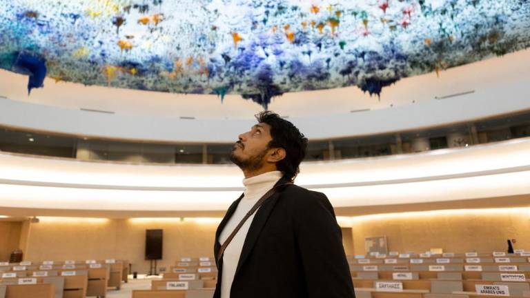 Espectáculos Tenoch Huerta mirando el techo abovedado de la Sala de los Derechos Humanos y la Alianza de Civilizaciones del Palacio de las Naciones de Ginebra( Fotos news.un.org ) Espectáculos Comparte Tenoch Huerta sus convicciones y emociones en la ONU contra el racismo 2 mayo 2023