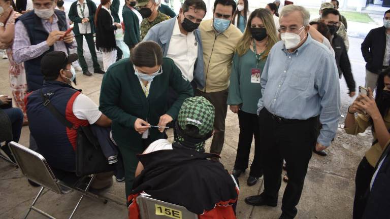 Culiacán El Gobernador Rubén Rocha Moya junto a otros funcionarios durante el inicio de la vacunación de refuerzo a trabajadores de la educación.( Fotos: Cortesía/Gobierno de Sinaloa ) Culiacán Docentes pidieron vacuna Moderna contra el Covid, afirma Rocha Moya 12 enero 2022