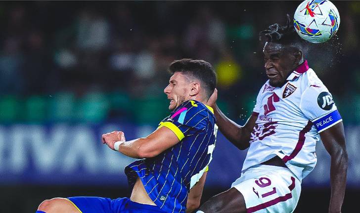 Futbol Duvan Zapata (91) busca el esférico en el aire por el Torino, que superó al Verona.( Foto: @SerieA ) Futbol Sanabria y Duvan Zapata ponen líder al Torino 20 septiembre 2024
