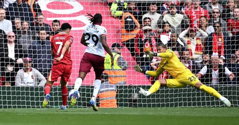 Futbol Luis Díaz abre el marcador.( Foto: Premier League ) Futbol Liverpool se acerca al título con una ajustada victoria sobre West Ham 13 abril 2025