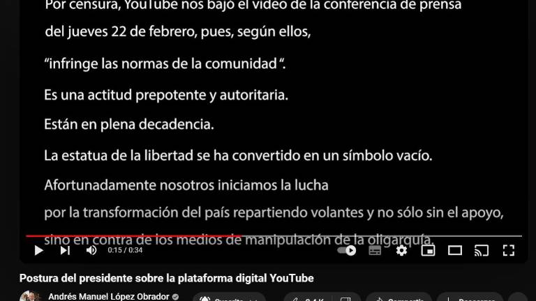 Nacional A través de un video publicado en su cuenta de YouTube, AMLO acusó que YouTube estaba “en plena decadencia”.( Foto: Captura de video. ) Nacional AMLO ahora ataca a YouTube; ‘es prepotente y está en plena decadencia’, afirma 25 febrero 2024