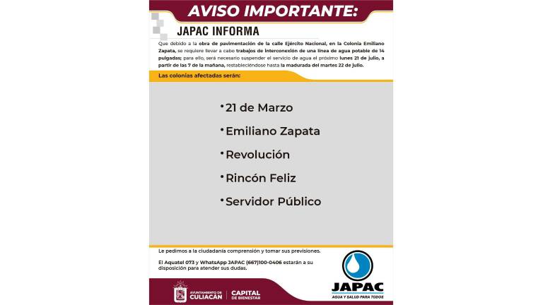 Jesús Higuera Laura, gerente de la Junta Municipal de Agua Potable y Alcantarillado de Culiacán, señaló que por instrucción del Alcalde a nadie se le va a cortar el agua, decisión que ya fue aprobada por el consejo directivo de la Japac.