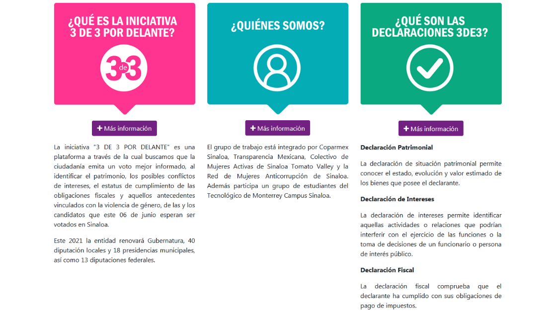 “Estos partidos son Fuerza por México, Morena, PAN, Partido Sinaloense y PRI, quienes registran distintos niveles de participación. Los partidos Acción Nacional y Revolucionario Institucional registran siete participantes, mientras que Fuerza por México y Morena solo uno. En el bloque de las candidaturas independientes, uno de los cuatro aspirantes se ha sumado a la iniciativa. Del Partido Sinaloense son tres candidaturas las que ya hicieron pública su #3de3”, señalan.
