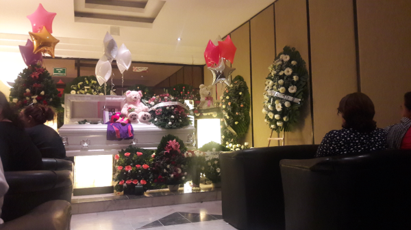 Papás de niños que estuvieron en terapia con Mari Carmen dejaron el hospital para despedir a la menor rodeada de globos, así como de flores rosas y blancas en sala de velación.