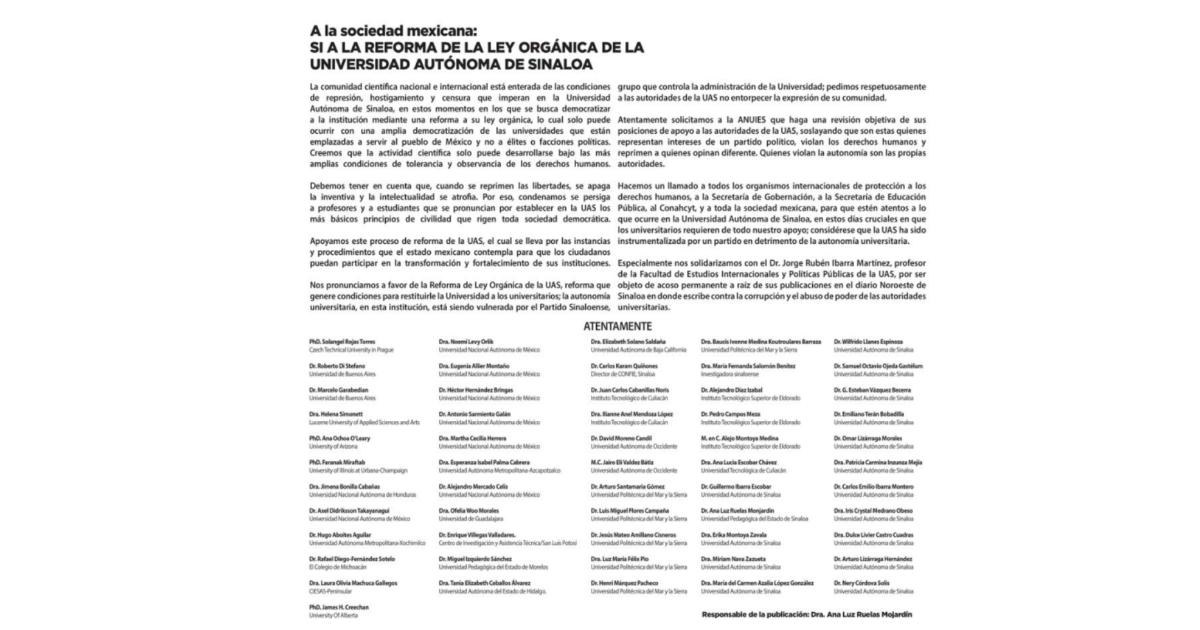 En ese sentido, expresaron su respaldo al académico Jorge Ibarra Martínez, investigador de la Facultad de Estudios Internacionales y Políticas Públicas, quien también es columnista en Noroeste.