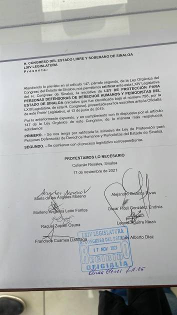 El grupo promotor de la iniciativa de ley, conformado por periodistas y defensores de derechos humanos, se presentó ante la Oficialía de Partes del Congreso del Estado en donde entregaron un oficio respaldado en el Artículo 147, párrafo segundo, de la Ley Orgánica del Congreso del Estado de Sinaloa.