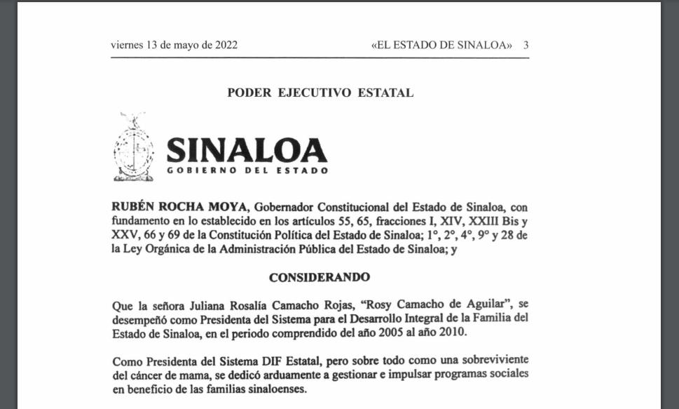Juliana Rosalía Camacho Rojas, Rosy Camacho de Aguilar, fue presidenta del DIF Sinaloa en el periodo comprendido de 2005 al 2010, años en que su esposo, Jesús Aguilar Padilla, fue el Gobernador del Estado, recuerda el acuerdo. Falleció el pasado 7 de marzo.