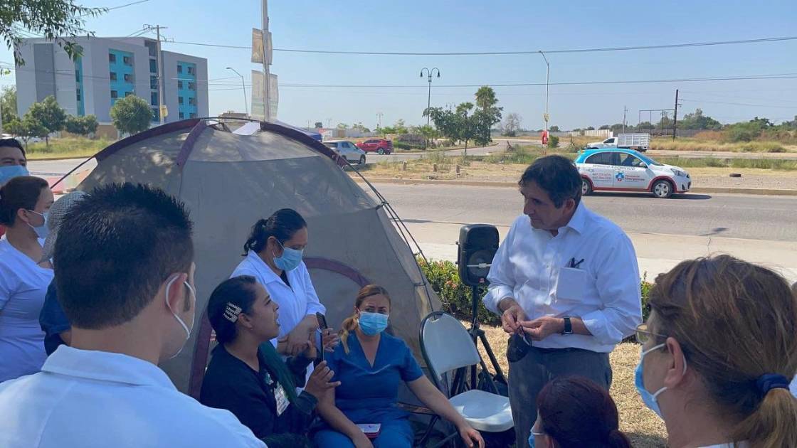 Tras tres días de manifestaciones del personal de salud por contrato que exigen bases sindicales, el Secretario de Salud estatal Héctor Melesio Cuén Ojeda acudió al plantón ubicado en el Hospital de la Mujer en Culiacán para dialogar con los trabajadores, informó la dependencia en un comunicado de prensa.