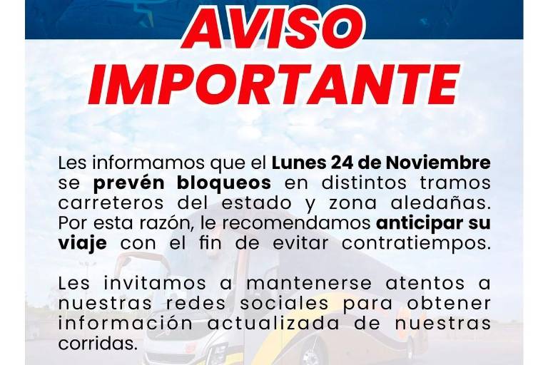 Diversas líneas de transporte terrestre en México emitieron alertas para sus usuarios ante los bloqueos carreteros que transportistas y agricultores han anunciado para este lunes 24 de noviembre, los cuales podrían afectar diferentes rutas a nivel nacional, incluyendo tramos de Sinaloa.