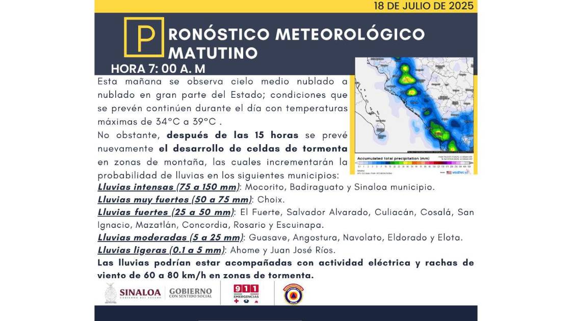 Para la jornada de este 18 de julio, Protección Civil Sinaloa pronosticó temperaturas altas entre 34 y 39 grados para el estado, con probabilidades de desarrollo de lluvias de manera generalizada en la entidad.