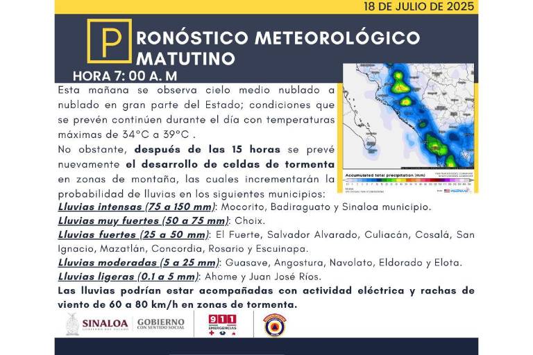 El Instituto Estatal de Protección Civil advirtió que para el fin de semana del 18 al 20 de julio se esperan lluvias intensas y fuertes en la mayor parte de Sinaloa.