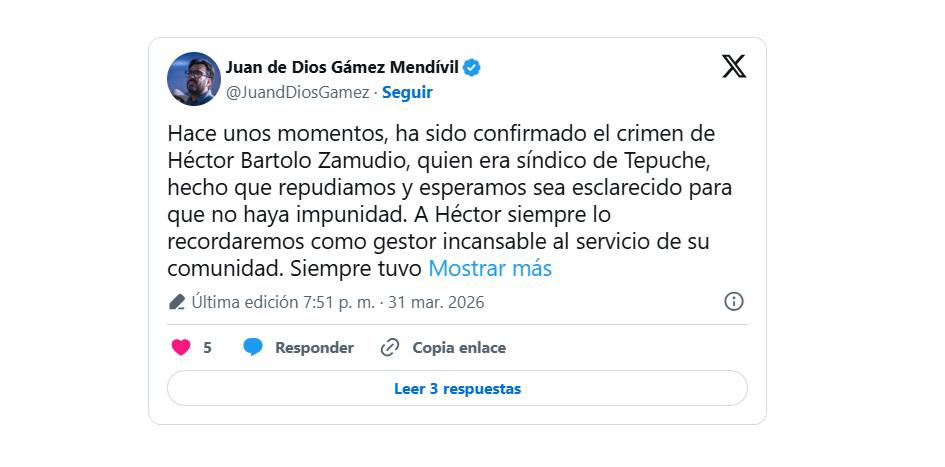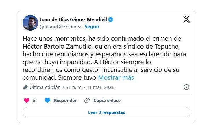 La confirmación se dio a través de un mensaje público difundido en redes sociales, donde el presidente municipal lamentó el crimen y expresó que se espera su esclarecimiento “para que no haya impunidad”.
