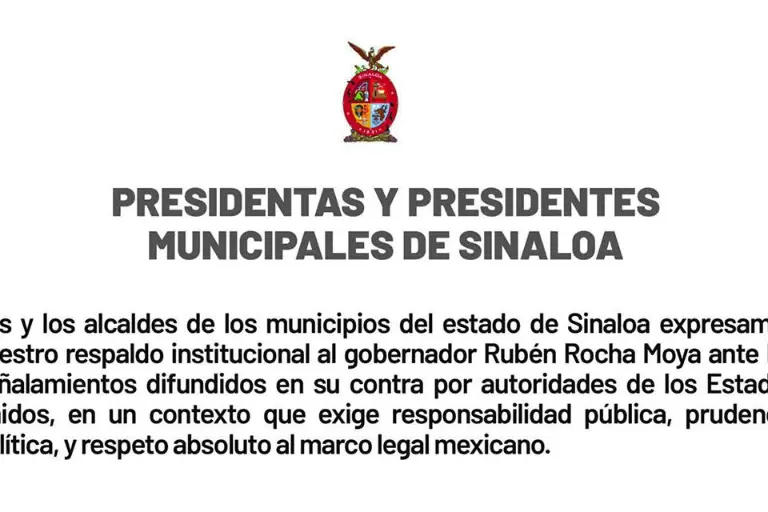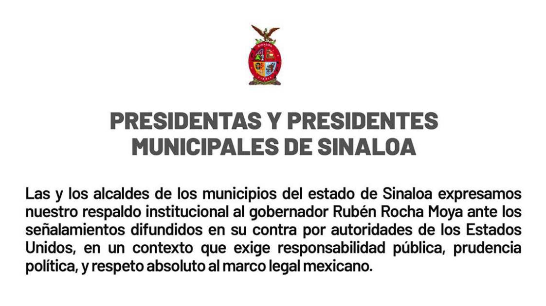 Un total de 18 de los 20 presidentes municipales de Sinaloa difundieron un posicionamiento conjunto para manifestar su apoyo al Gobernador Rubén Rocha Moya, luego de los señalamientos emitidos por el Departamento de Justicia de Estados Unidos.