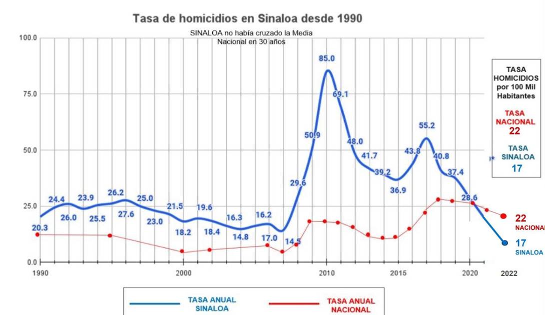 “Las mejoras más significativas ocurrieron en los indicadores de homicidios y delitos cometidos con armas de fuego, con tasas que cayeron un 20.9% y 25.2%, respectivamente. Sinaloa tuvo 163 homicidios menos en 2021 que en 2020 debido a las reducciones en el número de homicidios cometidos con arma de fuego”.