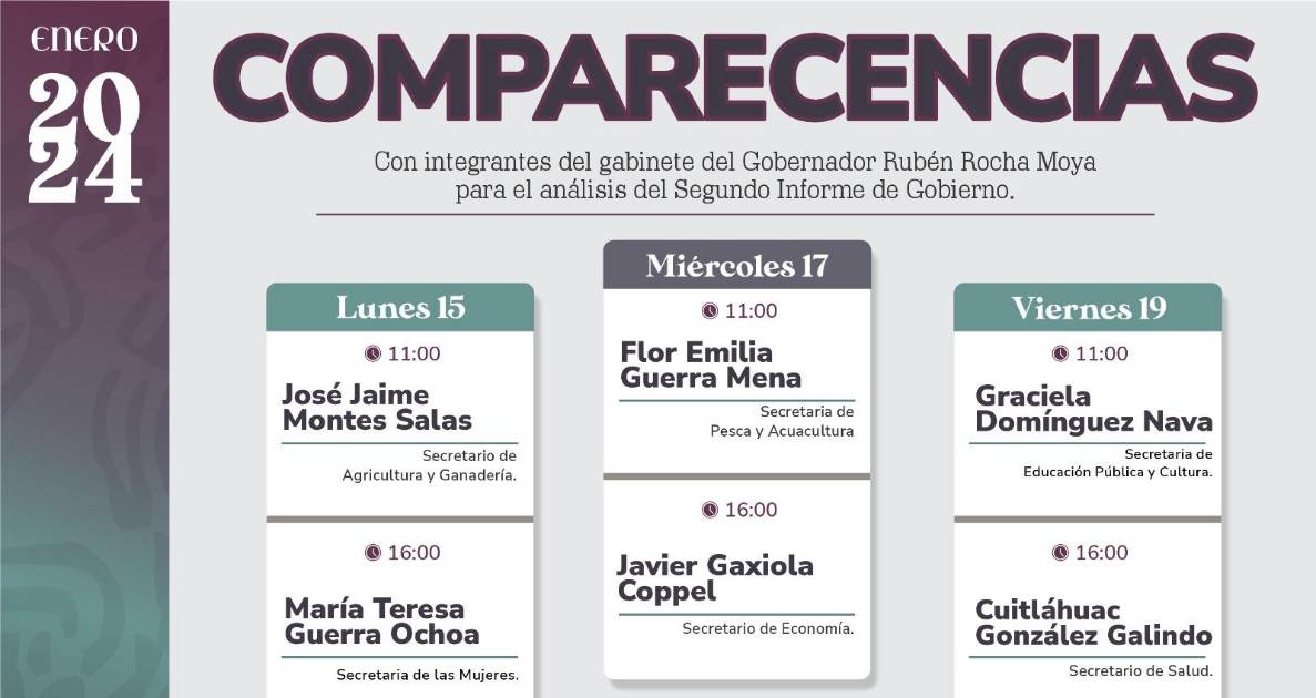 Los primeros dos titulares acudirán el 15 de enero y son José Jaime Montes Salas, Secretario de Agricultura y Ganadería, que estará a partir de las 11:00 horas; y María Teresa Guerra Ochoa, Secretaria de las Mujeres en Sinaloa, quien comparecerá a las 16:00 horas.