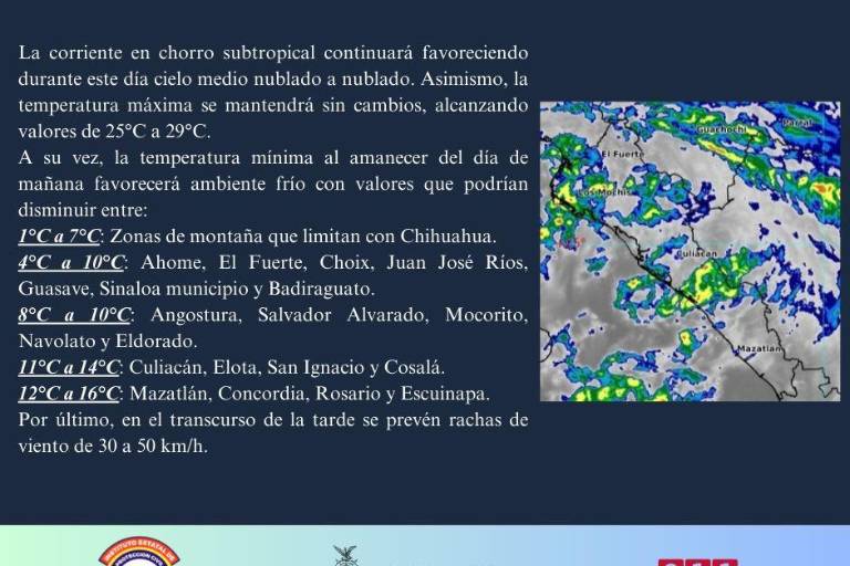 En los municipios del norte como Ahome, El Fuerte, Choix, Juan José Ríos, Guasave, Sinaloa municipio y Badiraguato, se espera que las temperaturas mínimas ronden entre los 4 y 10 grados.