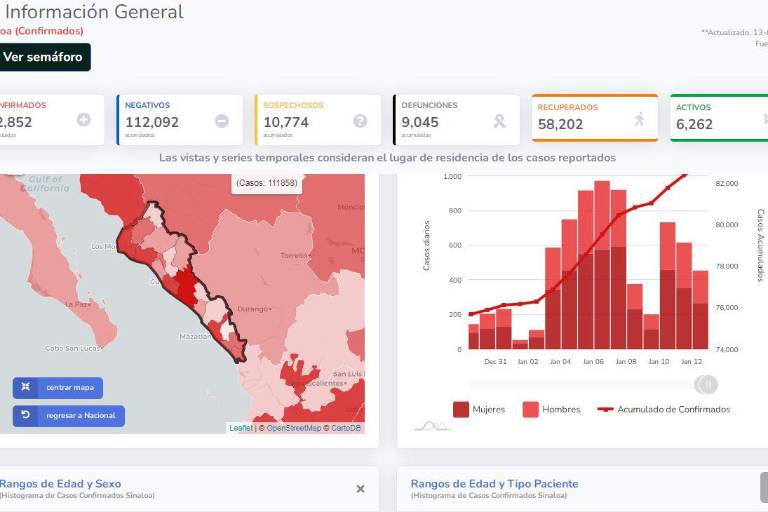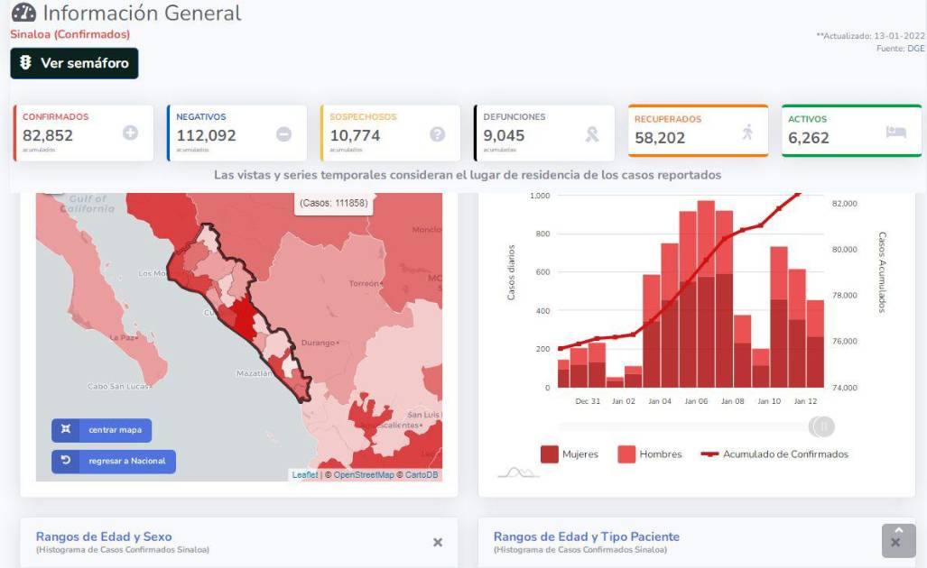 Tras ajustes que se anunciaron por parte de la Secretaría de Salud estatal, que provienen de la Dirección General de Epidemiología, ayer jueves 13 de enero, Sinaloa pasó de 5 mil 345 casos activos a mil 859 de un día para otro, pero de acuerdo a la plataforma de Gobierno de México, el estado tiene a esa fecha 6 mil 262 pacientes activos.