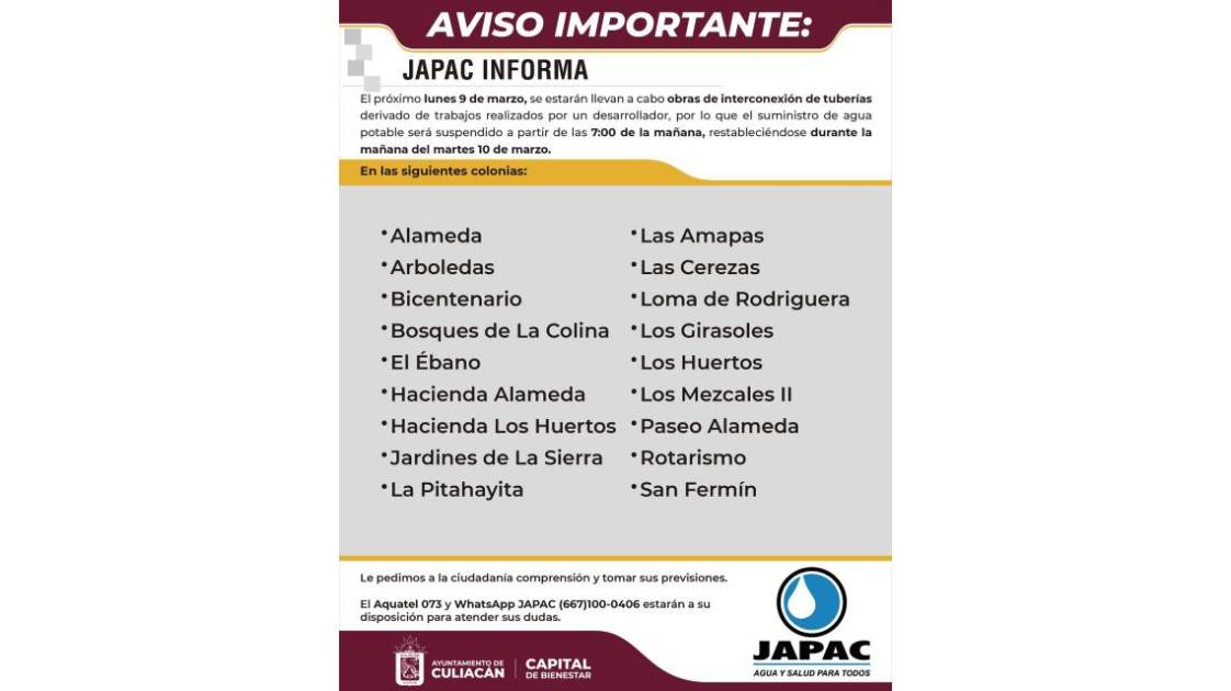 La Junta Municipal de Agua Potable y Alcantarillado de Culiacán informó que el próximo lunes 9 de marzo se llevarán a cabo trabajos de interconexión de tuberías, lo que resultará en la suspensión del suministro de agua potable en 18 colonias del norte de la ciudad.