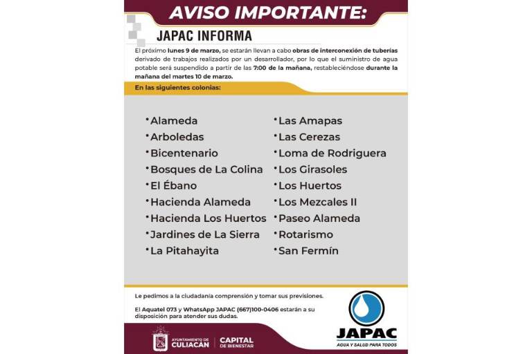 Para cualquier duda o reporte, la ciudadanía puede comunicarse a la línea Aquatel 073 o enviar un mensaje vía WhatsApp al número 6671000406, los cuales estarán disponibles para brindar atención.