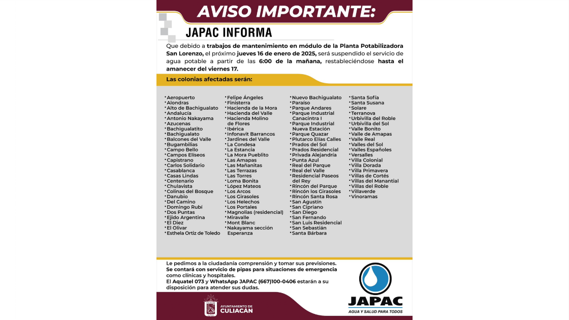 Japac también sugirió revisar la lista completa de las colonias que no tendrán servicio este jueves en el portal japac.gob.mx o bien escribir al WhatsApp 6671 00 04 03.