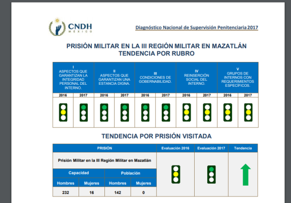 Según el documento, presentado la semana, la prisión militar en territorio sinaloense registró mejoras en los aspectos que garantizan la integridad personal de los internos y en la atención a grupos de internos con requerimientos específicos.