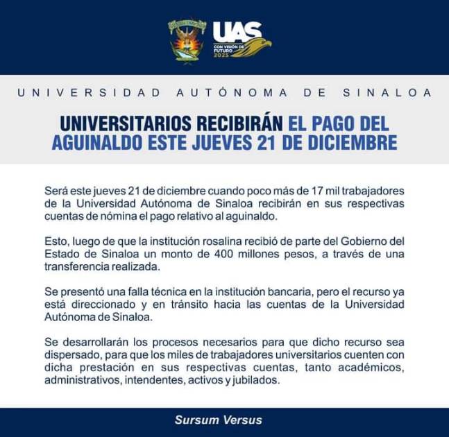 CULIACÁN._ Los empleados de la Universidad Autónoma de Sinaloa sí recibirán el pago de sus aguinaldos este 21 de diciembre, pese a las fallas técnicas suscitadas en el proceso, aseguró la propia institución.