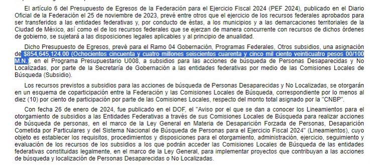 De acuerdo con el reporte publicado en el Diario Oficial de la Federación este 2024 el Presupuesto de Egresos de la Federación tiene disponibles 854 millones 645 mil 124 pesos para el Programa Presupuestario U008, a subsidios para las acciones de búsqueda de Personas Desaparecidas y No Localizadas por parte de la Secretaría de Gobernación a las entidades federativas por medio de las Comisiones Locales de Búsqueda.