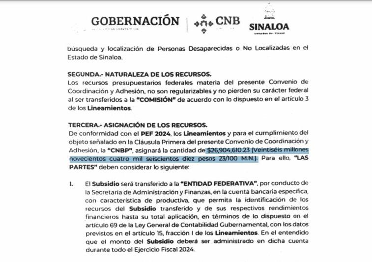 De estos más de 850 millones de pesos la Comisión Estatal de Búsqueda de Sinaloa recibirá 26 millones 904 mil 610 pesos, según el documento de firma de convenio signado por el subsecretario de Gobierno y encargado del despacho de la Secretaría General de Gobierno Rodolfo Jiménez López.