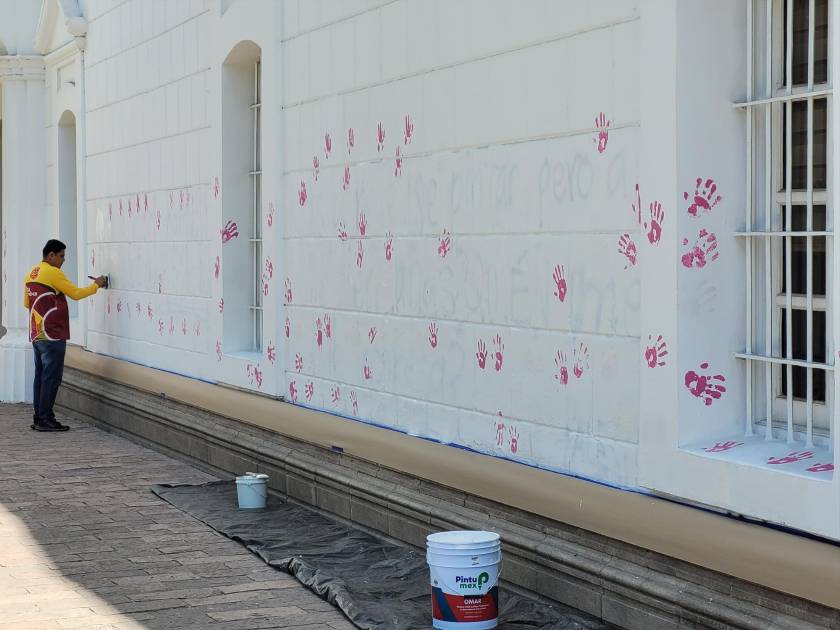 Tras la intervención con pintas de mujeres en el Palacio Municipal, trabajadores del Ayuntamiento de Culiacán cubrieron las expresiones gráficas con pintura blanca, sólo dos horas después.
