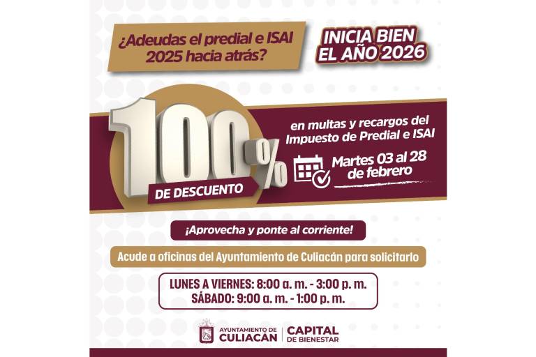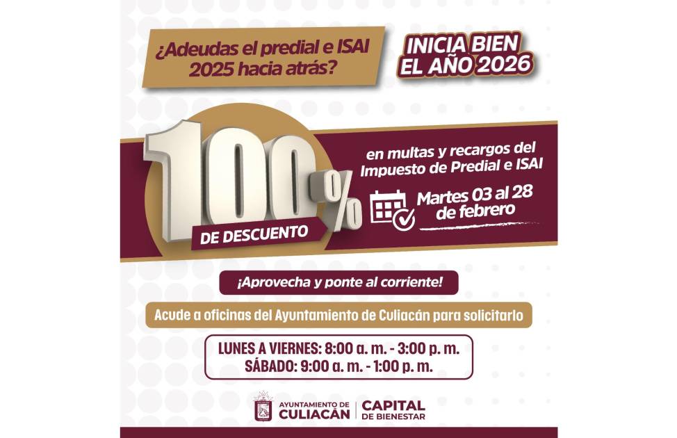 Con el fin de fortalecer la recaudación municipal y combatir el rezago de cuentas, el Ayuntamiento de Culiacán puso en marcha la campaña “Inicia Bien el Año 2026”, que estará disponible hasta el 28 de febrero y contempla el 100 por ciento de descuento en multas y recargos tanto del Impuesto Predial como del ISAI.