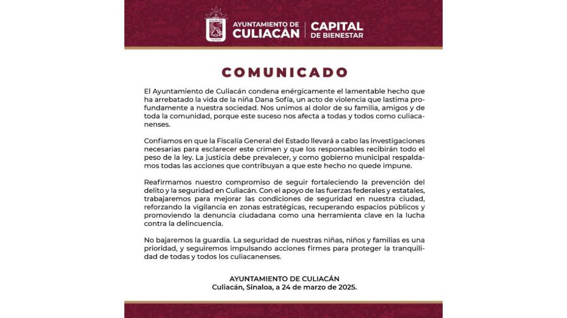 ”El Ayuntamiento de Culiacán condena enérgicamente el lamentable hecho que ha arrebatado la vida de la niña Dana Sofía, un acto de violencia que lastima profundamente a nuestra sociedad. Nos unimos al dolor de su familia, amigos y de toda su comunidad, porque este suceso nos afecta a todas y todos como culiacanenses”.