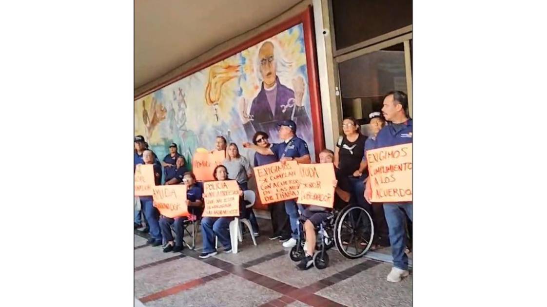 Un medio centenar de policías jubilados y pensionados mantienen un bloqueo de las puertas de acceso del Palacio de Gobierno desde hace algunos minutos en Culiacán.