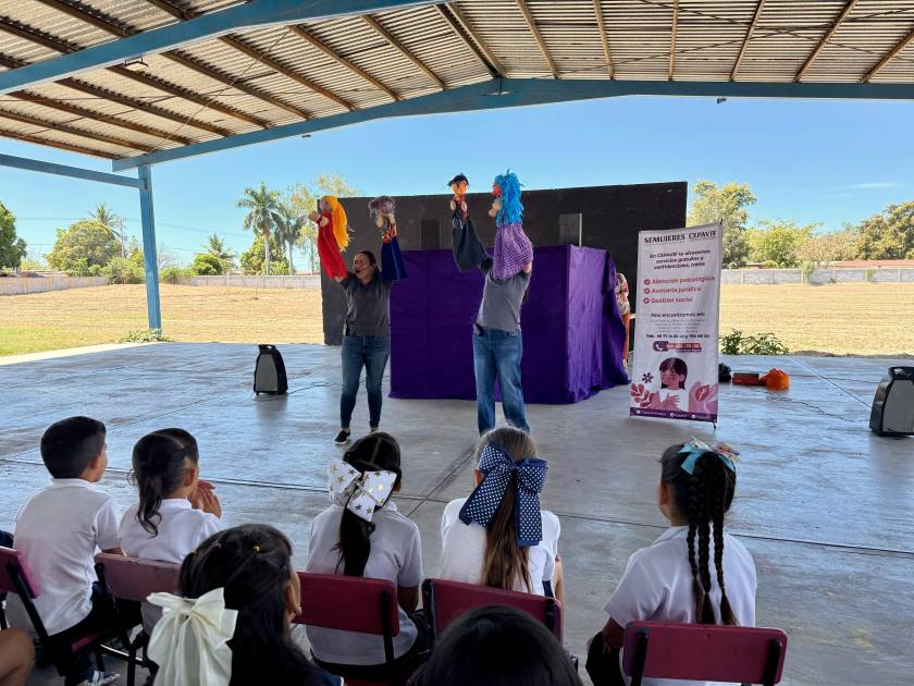 La puesta en escena, presentada por el Consejo Estatal para la Prevención y Atención de la Violencia Familiar, aborda de manera lúdica y sensible situaciones cotidianas para que las niñas y niños aprendan a identificar conductas que representan violencia.