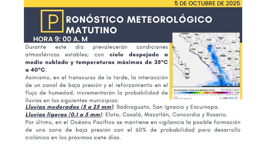 El reporte de Protección Civil indica lluvias moderadas en los municipios de Badiraguato, San Ignacio y Escuinapa, así como precipitaciones ligeras en Elota, Cosalá, Mazatlán, Concordia y Rosario.