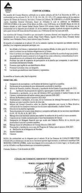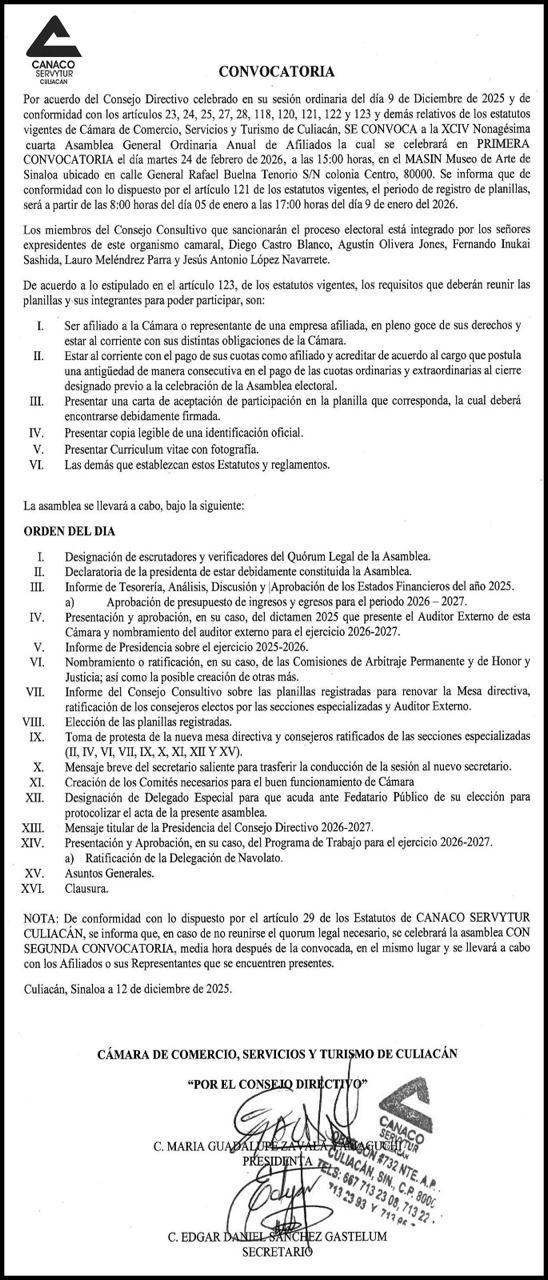 Por acuerdo del Consejo Directivo celebrado en su sesión ordinaria del día 9 de Diciembre de 2025 y de conformidad con los artículos 23, 24, 25, 27, 28, 118, 120, 121, 122 y 123 y demás relativos de los estatutos vigentes de Cámara de Comercio, Servicios y Turismo de Culiacán, SE CONVOCA a la XCIV Nonagésima cuarta Asamblea General Ordinaria Anual de Afiliados la cual se celebrará en PRIMERA CONVOCATORIA el día martes 24 de febrero de 2026, a las 15:00 horas, en el MASIN Museo de Arte de Sinaloa ubicado en calle General Rafael Buelna Tenorio S/N colonia Centro, 80000. Se informa que de conformidad con lo dispuesto por el artículo 121 de los estatutos vigentes, el periodo de registro de planillas, será a partir de las 8:00 horas del día 05 de enero a las 17:00 horas del día 9 de enero de 2026.