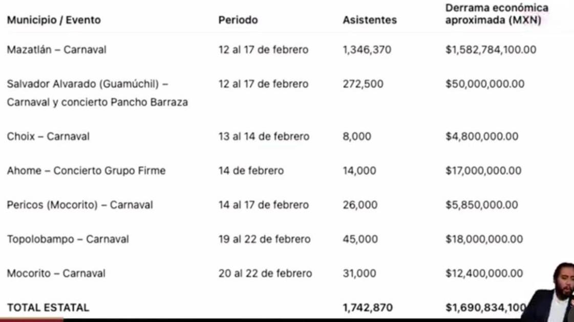 Los carnavales y conciertos realizados en diversos municipios de Sinaloa entre el 12 y el 22 de febrero dejaron una derrama económica aproximada de mil 690 millones 834 mil 100 pesos y una asistencia acumulada de un millón 742 mil 870 personas, de acuerdo con cifras oficiales del Gobierno de Sinaloa.