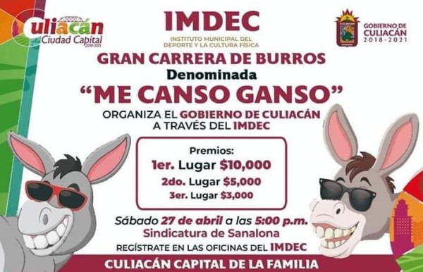La carrera de burros "Me canso ganso" que organiza el Instituto Municipal del Deporte en Coordinación con la Secretaría de Turismo de Culiacán se hace con la intención de innovar, afirmó Octavio Lara Cebreros.