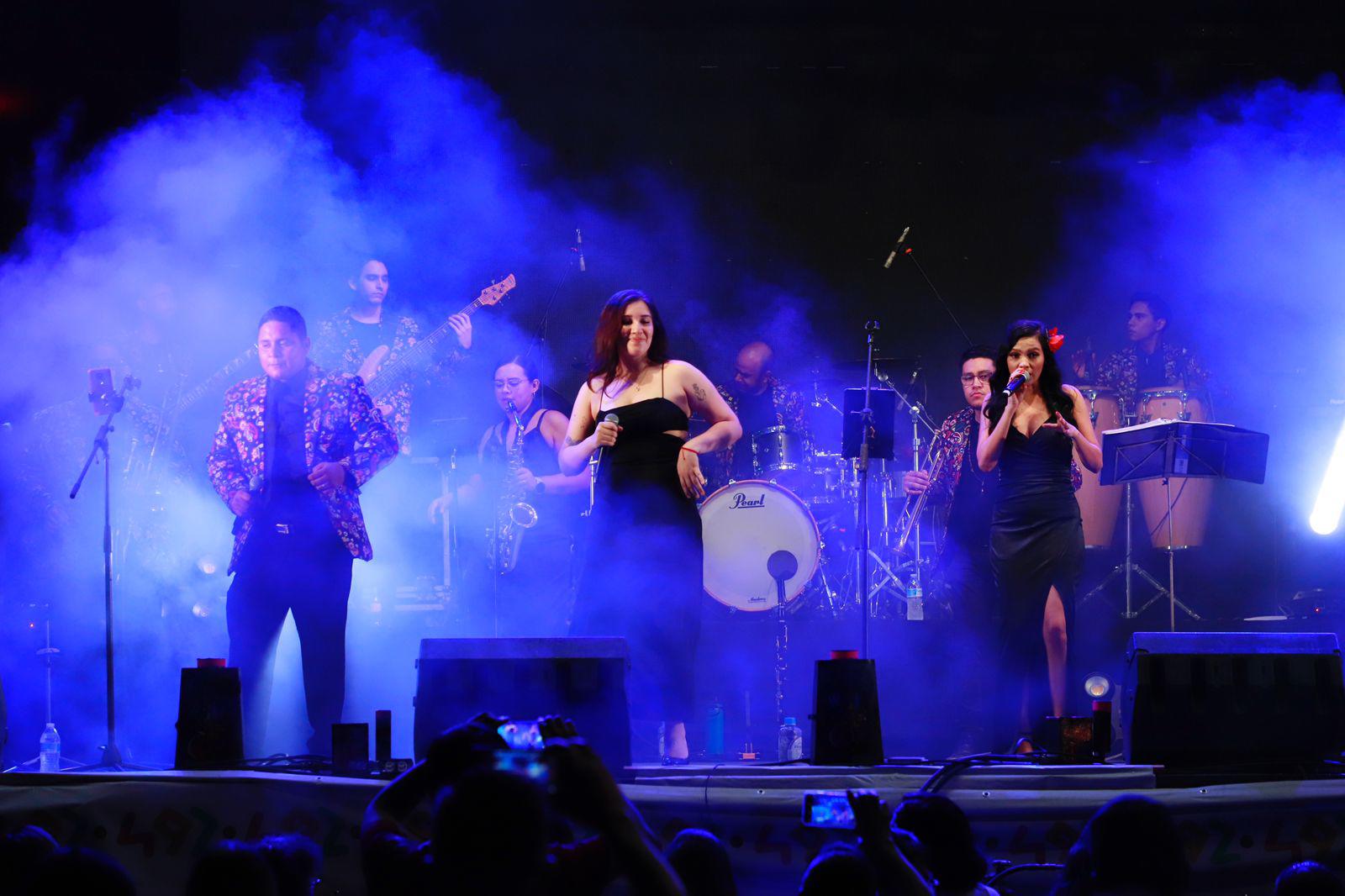 A la altura de la Mariano Escobedo, desde niños hasta adultos de la tercera edad, bailan al son de los cumbias que interpreta Kabonys Band frente al Palacio Municipal.