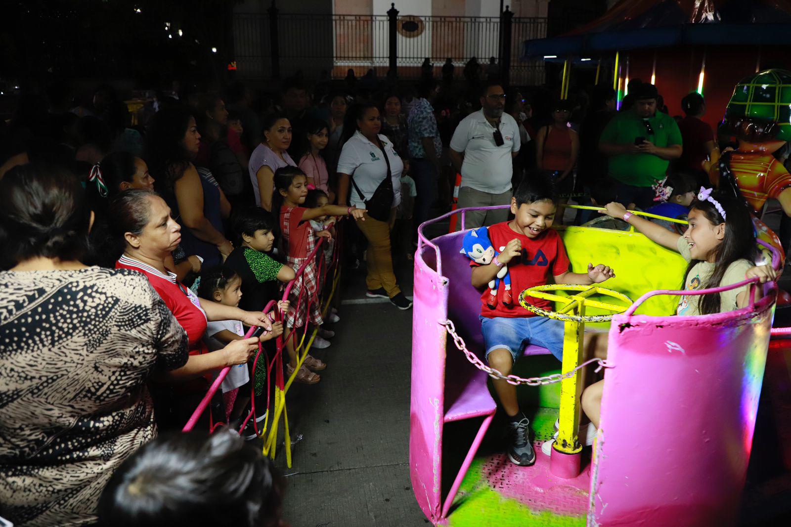 Chicos y grandes suspenden por los aires en los juegos mecánicos de la Feria del 492 Aniversario de la ciudad.