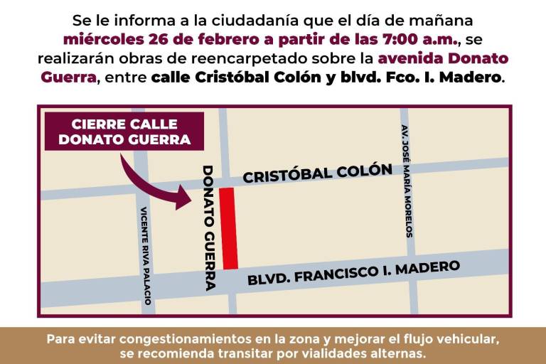 CULIACÁN._ A partir de las 7:00 horas de este miércoles 26 de febrero permanecerá cerrada la avenida Donato Guerra, en el tramo entre la calle Cristóbal Colón y el bulevar Francisco I. Madero, en el centro de Culiacán.