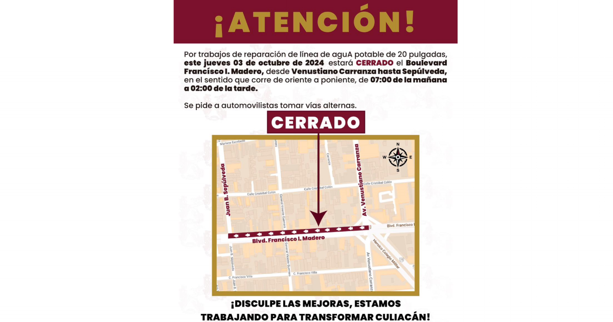 El Ayuntamiento de Culiacán informó que este jueves cerrarán un tramo del bulevar Francisco I. Madero, debido a trabajos de reparación de una tubería de agua potable.