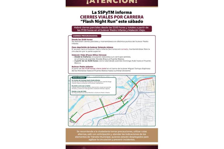 Con motivo del evento “Flash Night Run”, organizado por el Ayuntamiento de Culiacán, durante este sábado estará cerrado el paso vehicular en distintos tramos del bulevar Pedro Infante y el Paseo Niños Héroes (Malecón Viejo), en Culiacán.