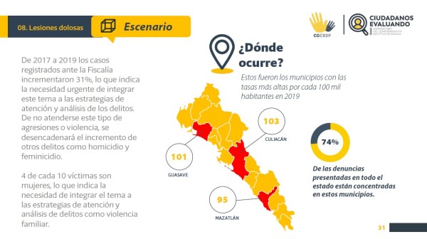 “La tasa de lesiones dolosas en Sinaloa es de 80 casos por cada 100 mil habitantes, casi el triple de la tasa de homicidio doloso que es de 27 por cada 100 mil habitantes. Las lesiones dolosas pueden generarse por riñas, enfrentamientos o problemas familiares, por lo que se considera la antesala de delitos graves como el feminicidio o el homicidio doloso”, determinó Ciudadanos Evaluando en un análisis difundido.