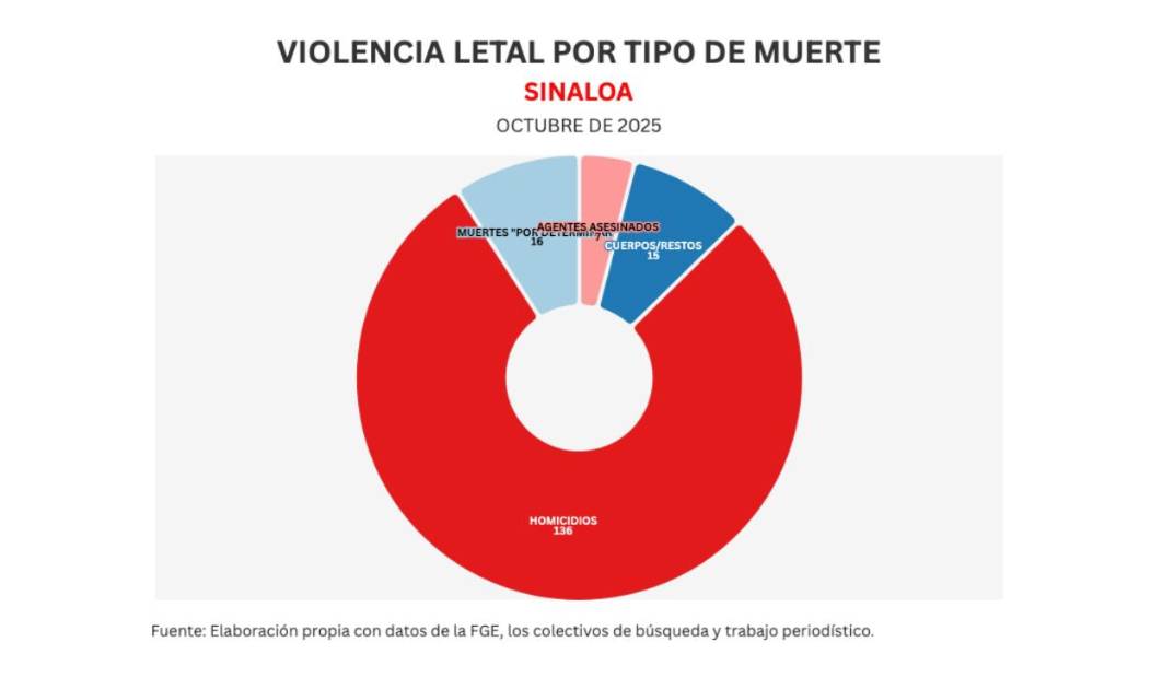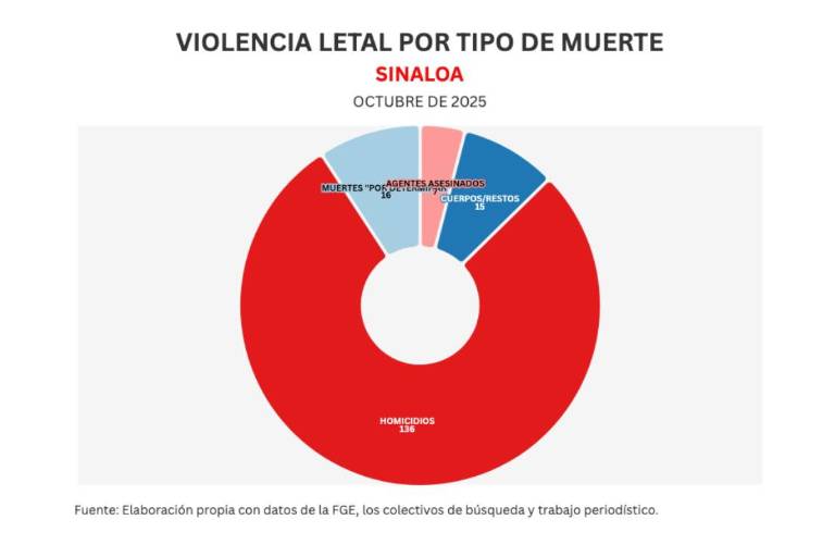 Sinaloa concluyó el mes de octubre con 174 muertes atribuibles a razones dolosas, lo que representa 19 por ciento más que las 146 reportadas en septiembre pasado, hilando así dos meses consecutivos a la alza en violencia letal.