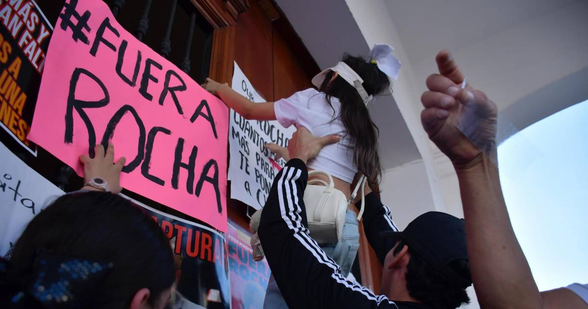 Los manifestantes saturaron la fachada del Ayuntamiento de Culiacán con carteles en contra de diversas autoridades y de manera simultánea pedían la renuncia del Alcalde Juan de Dios Gámez Mendívil.