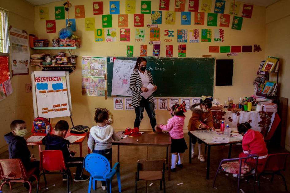Claudia lleva un grupo de 17 niños y niñas, pero por el momento no todos están asistiendo, en el aula, los pequeños portan su cubrebocas todo el tiempo, la pandemia aunque en un momento detuvo su proceso de aprendizaje presencial, desde hace tiempo ha sido retomado.