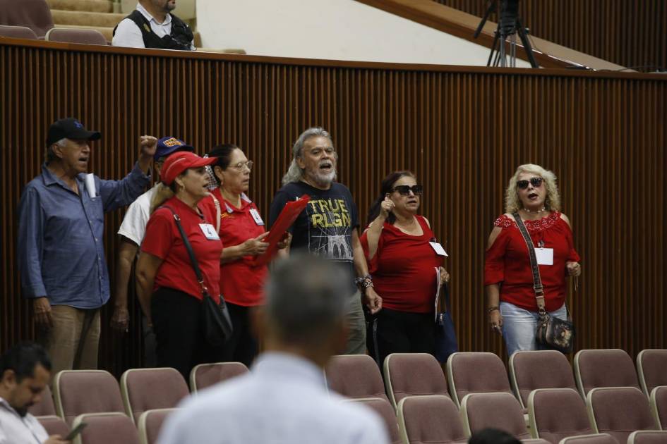 Un grupo cercano a la decena de personas ingresó al salón de sesiones del Legislativo para externar sus exigencias en plena sesión parlamentaria.