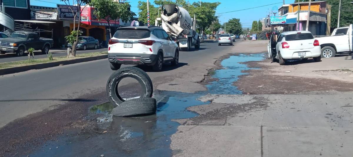 Se observó que la fuga de agua pasó por lo menos en tres cuadras, antes cruzar a la calle Fray Bernardo de Sahagún está uno de los brotes de agua y después del cruce de la calle Francisco Javier Gaxiola, hay un hoyo con listón que prohíbe acercarse y agua estancada, al frente de una farmacia.